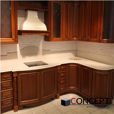 Столешницы для кухни из камня обладают множеством достоинств. Акриловые столешницы не разрушаются с течением лет, они устойчивы к поражению грибком, агрессивному воздействию химических сред. Их поверхность, в отличие от холодного натурального камня, на ощупь достаточно приятна.
